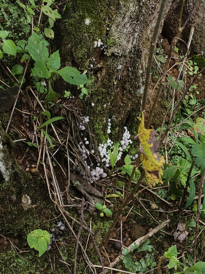 The image features a close-up view of the base of a tree surrounded by dense foliage and various small plants. Several clusters of tiny white and grey mushrooms are scattered around the base of the tree, both on the ground and growing on the tree trunk covered in moss. Decomposing leaves, twigs, and other organic matter are present on the ground, contributing to the forest floor ambiance. A yellow and brown leaf hangs from a thin branch, adding to the natural and slightly decaying environment.