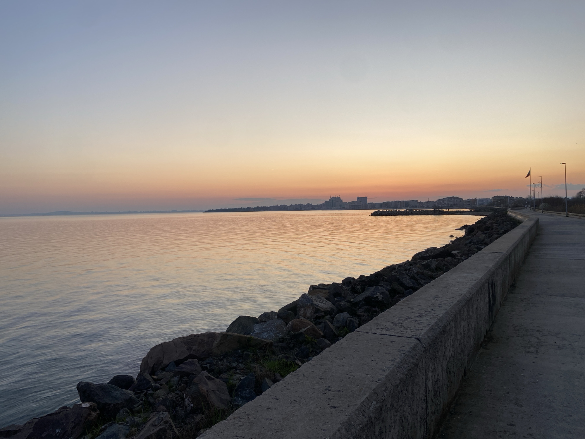 The image depicts a serene sunset scene in Pomorie, Bulgaria, featuring the Black Sea coastline. A concrete walkway runs along the right side of the frame, bordered by a rock barrier separating it from the water. The sea reflects the colors of the sunset, transitioning from a light blue to an orange hue near the horizon. In the distance, a cityscape is visible, with buildings and structures silhouetted against the colorful sky. Several streetlights and a Bulgarian flag are visible along the walkway, indicating a public space. The scene is still, with no people immediately visible.