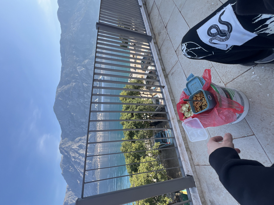 The scene depicts an outdoor setting on a tiled balcony or terrace in Donji Orahovac, Montenegro, overlooking the Bay of Kotor. The foreground features a partial view of an individual's left arm, clad in a black sleeve, and their right leg, wearing black trousers with a white patch depicting a coiled black snake. A white cylindrical bucket, possibly a paint container, serves as a stand, draped with a red plastic bag. On this stand, an open light-blue lunchbox contains noodles with a fork inserted, alongside a clear plastic container holding leafy greens and another open clear plastic container with three compartments. A grey metal railing with vertical bars spans the midground, separating the balcony from the view below. Directly beneath the railing are several green-leaved trees, partially obscuring a parking area where a light blue hatchback and another vehicle are visible. Beyond the immediate foreground, the calm, blue-green waters of the Bay of Kotor stretch towards the background. A distant settlement with buildings and red-tiled roofs lines the opposite shore. A large white cruise ship is visible moving across the water. Majestic, rugged grey-blue mountains rise sharply from the water's edge, forming the dominant backdrop under a clear, bright blue sky with minimal cloud cover.