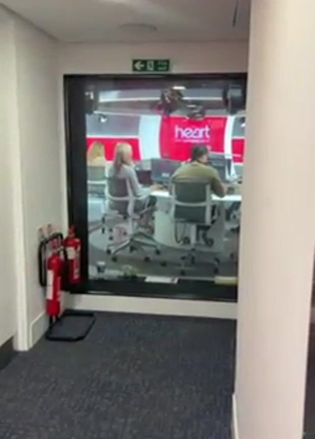 radio station control room through a glass window. Three people are working at desks with computer monitors. One person is wearing a light blue shirt and jeans, another is wearing a green shirt, and a third person is partially visible. The radio station logo, "Heart," is visible in the background. There are fire extinguishers mounted on the wall outside the room. The room is well-lit and appears to be a professional work environment.