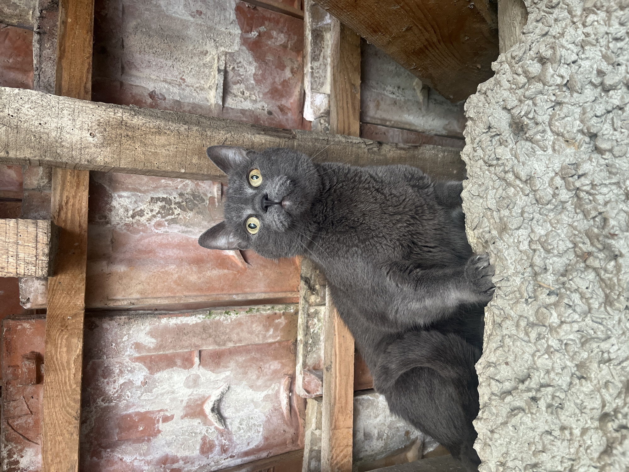 This image, captured in Blaskovo, Bulgaria, depicts a grey, short-haired domestic cat with prominent yellow eyes, situated on a coarse, light grey aggregate surface. The cat is positioned centrally, facing forward but looking intently upwards and slightly to its right, with its pupils moderately dilated and its mouth slightly agape, revealing a pink nose. Its right forepaw is visible resting on the aggregate. The background consists of exposed structural elements: multiple weathered wooden beams are present, including a prominent vertical beam displaying insect boreholes to the right of the cat, and a horizontal beam running behind its midsection. Behind these wooden components, rows of aged red terracotta roof tiles or bricks are visible, partially covered with white crystalline deposits and some green biological growth. The scene suggests an uninsulated attic or an enclosed utility space beneath a roof structure.