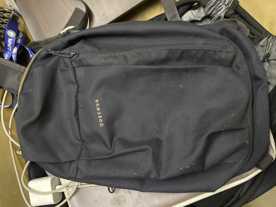 A black Quechua backpack lies on a surface covered in wires, an adapter, and another, larger, backpack. The backpack appears to be well-worn, with visible dirt and dust. The scene is indoors and the lighting is dim. This location at latitude 26.863, longitude 75.821 is in Jaipur, India.