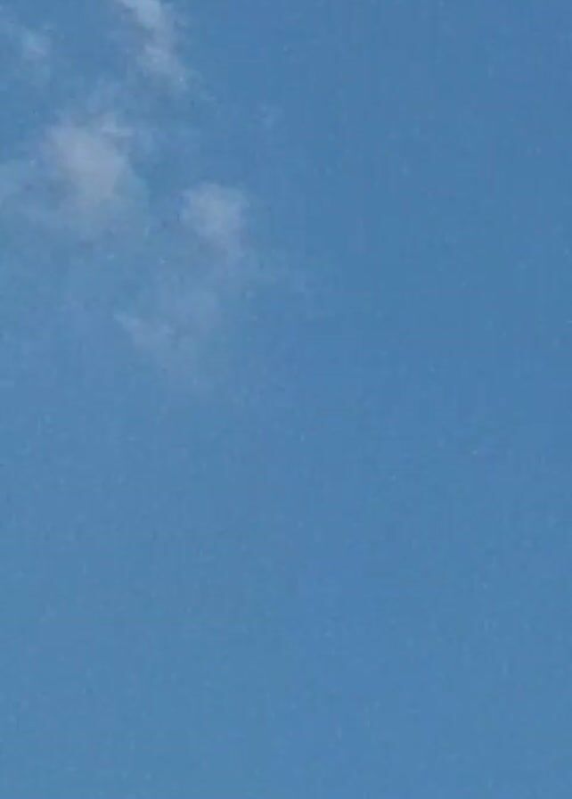 bird soaring in a clear blue sky. The bird appears dark and the sky has some light clouds. The camera follows the bird as it flies across the frame and eventually out of view. The background noise suggests the presence of traffic or other vehicles.