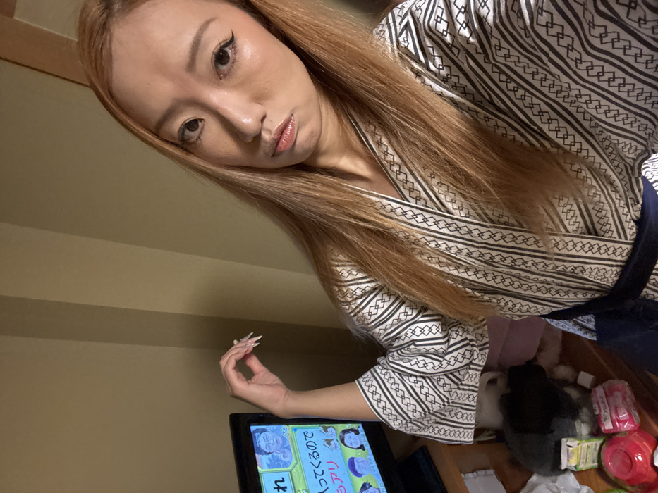 The scene depicts an indoor setting, likely a room within accommodations in Hakuba, Japan. A female individual with long, straight, light brown hair and a light complexion occupies the foreground, looking directly at the camera with a neutral expression and slightly pursed lips. She is wearing a patterned white and black traditional Japanese robe, possibly a yukata, secured with a dark blue obi. Her left arm is bent, hand raised, showcasing her long, pointed, light-colored fingernails. To the left, a small black television screen displays a Japanese program featuring multiple individuals and text. Below the television, on a light wooden surface, rests a small, dark-colored pet, possibly a cat or rabbit, next to various packaged items, including a red container and several packets with Japanese text. The room features plain light brown walls, with vertical darker panels or shadows visible.