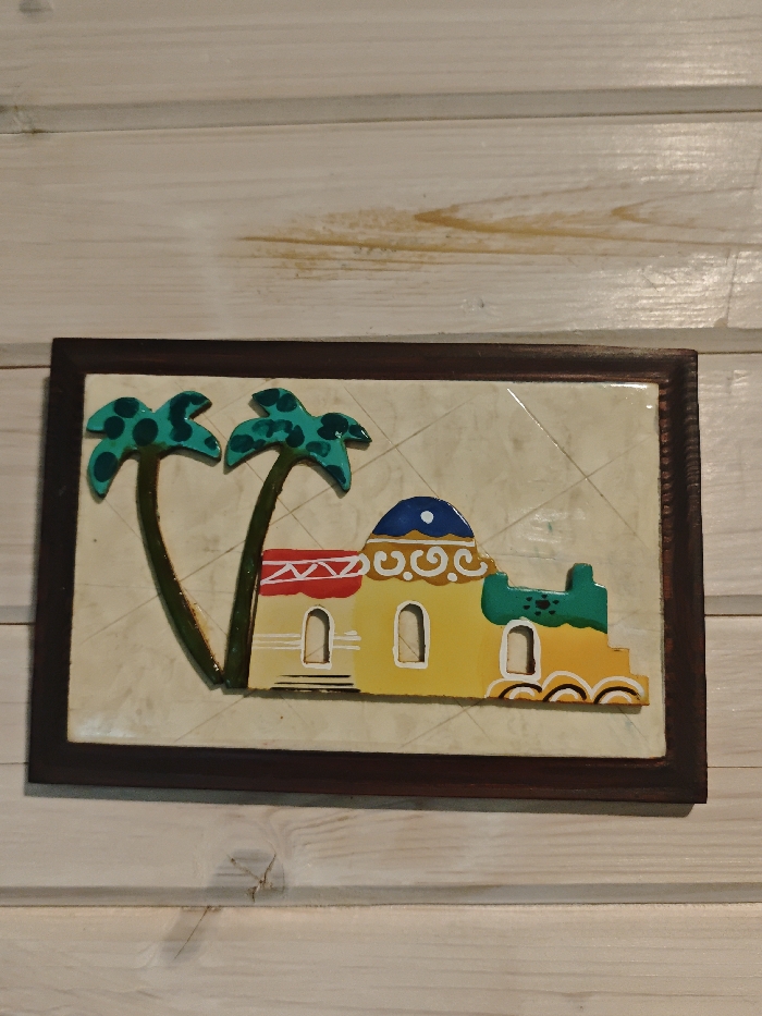A rectangular, dark brown framed artwork is centrally positioned against a light off-white horizontal wooden plank wall in Свистуха (кузяевский С/о), Russia. The artwork features a raised, stylized depiction of two dark green palm trees with teal fronds on a textured beige background with subtle diagonal lines. To the right of the palm trees are three vibrantly colored, low-rise buildings. The leftmost building is yellow with a red and white striped roof and a single arched doorway. Adjacent to it, a larger yellow building with a blue dome roof, topped by a white dot, also features an arched doorway and a decorative band of orange-brown spirals. To the right, a smaller teal and yellow building has stepped levels, an arched doorway, and a pattern of white semi-circles at its base. The wooden wall exhibits visible grain, knots, and slight brown discoloration in the upper area. No individuals are present.