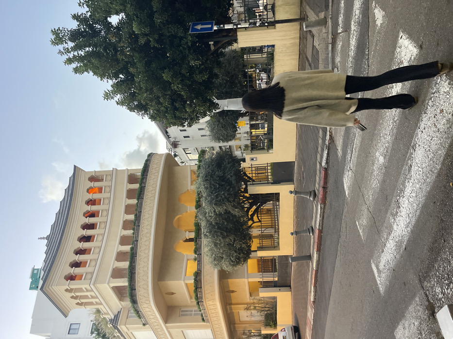 The image captures an urban street scene in Tel Aviv, Israel, featuring the Pagoda House located at King Albert Square (Nachmani Street and Montefiore Street). The scene is set during late afternoon or early evening, characterized by soft natural light and activated artificial lighting within the buildings. The Pagoda House, a multi-story, light-yellow building with distinctive Eclectic architectural elements, occupies the left portion of the frame. It features curved balconies with intricate balustrades, rows of arched windows, and a tiered roof structure with a prominent finial. Multiple windows, particularly on the upper floors, emit a warm orange glow. Greenery is visible in planters along the balconies and within the gated property. In the foreground, a person, viewed from behind, traverses a white zebra crossing on an asphalt road. The individual possesses dark, shoulder-length hair and is attired in a loose-fitting, light-colored (beige/cream) long-sleeved top and dark flared trousers. A dark, rectangular object, consistent with a mobile phone, is held in their right hand. The sidewalk bordering the Pagoda House property is equipped with several grey bollards. A partially visible white car is parked on the street to the left. On the right side of the street, a blue traffic sign featuring a white upward-pointing arrow indicates a one-way street. Lush, dark green trees line the street and are situated within the gated property. Additional multi-story residential buildings are visible in the background under a pale sky with scattered clouds.