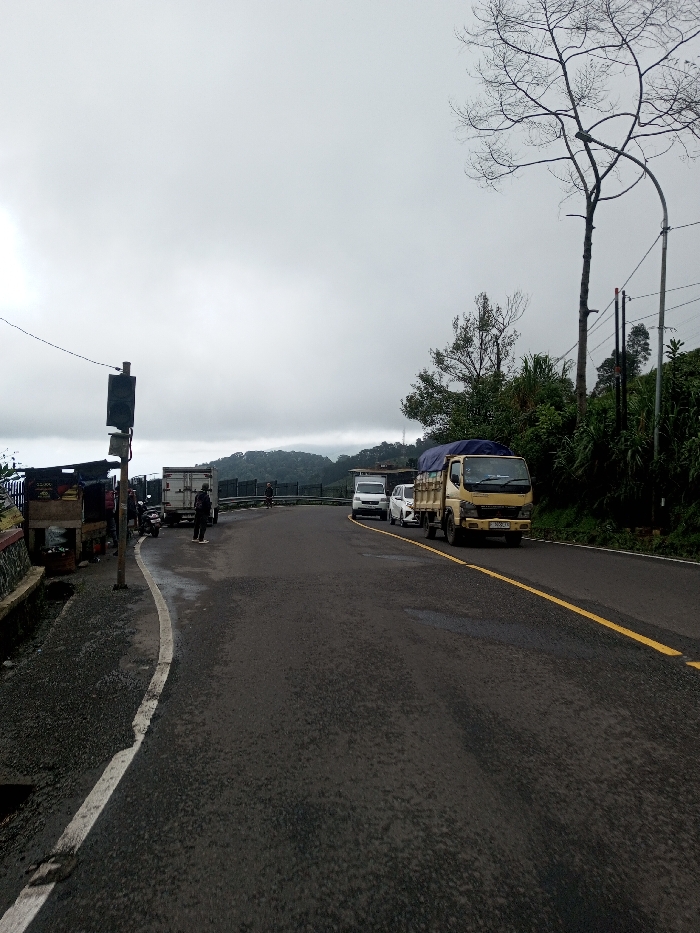 The scene depicts a winding asphalt road within the city of Bangtsho, Bhutan, under an overcast sky. The road curves to the right, marked by a solid yellow line on the right side and a white shoulder line on the left. On the left side of the road, two roadside stalls with dark roofs and counters are present, adjacent to a concrete barrier and a metal guardrail. A dark utility pole with a rectangular box-like component stands near the stalls. A scooter is parked near the stalls. A person in dark clothing stands near a white box truck parked further along the left shoulder. Another individual is visible down the road on the left. On the right side of the road, a yellow light truck with a blue tarp covering its bed is present, followed by a white sedan and a white van. The right side of the road is bordered by dense green vegetation and a prominent tall, bare deciduous tree. A utility pole is also visible on the right. Distant forested hills are discernible in the background beneath the gray sky.