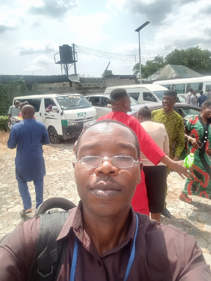 The image depicts an outdoor daytime scene in a paved open area in Port Harcourt, Rivers, Nigeria, under a partly cloudy sky. In the foreground, a male individual with dark skin, glasses, a mustache, and a short haircut is captured in a selfie. He wears a dark brown collared shirt and a black backpack, with a blue lanyard visible around his neck. His expression is neutral. In the midground to the left, a male wearing a blue kaftan and matching trousers walks away from the camera. Behind him, a white Toyota Hiace commuter van with "ECN" inscribed in green on the front bumper and "TO SEE" above the windshield is parked. A partially obscured group of individuals is gathered near the van, including one male in a light green shirt. Further back, a concrete block wall partially covered in green foliage runs horizontally, behind which a metal water tank on a tall metal stand and power lines are visible. To the right in the midground, a group of three individuals is engaged in social interaction. A male in a red long-sleeved garment stands facing left, conversing with another male to his right. This second male wears a yellow and green patterned traditional top and a dark cap, and is captured in mid-laughter with his mouth open. To his immediate right, a female wearing a green, red, and black patterned dress holds a small, clear green plastic bottle in her right hand. The background features several other parked vehicles, including a white van and a large white bus. A modern street light pole with a solar panel on top stands in the right background. The ground is surfaced with light-colored interlocking concrete pavers. The scene conveys a casual gathering or public activity. The visible architecture, vehicle types, and attire are consistent with an urban environment in Nigeria.