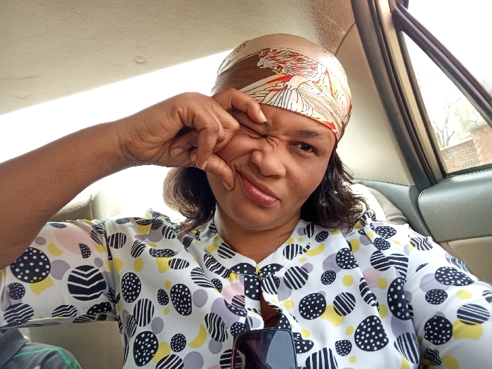 The image displays an adult female seated inside a vehicle in Jimeta, Nigeria