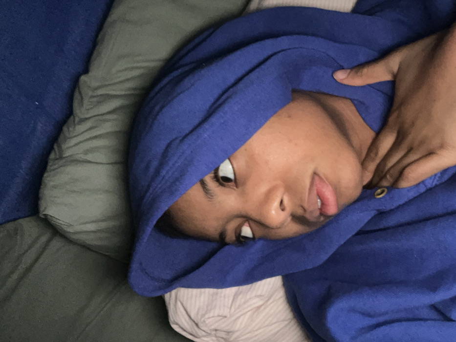 A person lies on a bed, wrapped in a blue hooded garment. One hand is visible near the neck, and the head is turned to the side, revealing a face with eyes looking upward and the tongue slightly protruding. The background includes an olive-green pillow or cushion, and a blue fabric next to it. A pink and white striped fabric is visible beneath the person's head. The scene is lit with a somewhat dim and diffused light.