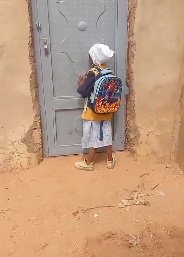 A young child with a white head covering and a Spiderman backpack stands facing a gray metal door set in a textured, earthen wall. The child is wearing a yellow shirt, a checkered skirt, and tan shoes. They are reaching for the door's knob. The ground is sandy and appears dry. The surrounding walls show signs of age and weathering.