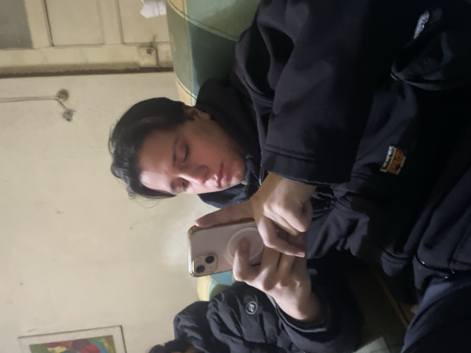 A person lies on a green and yellow couch, eyes closed, and holding a gold-colored phone with a white circular magnet attached to the back. They wear a dark jacket and dark hoodie, with a small yellow square patch visible on the right side of the jacket. A reflection of the person wearing a similar dark jacket is visible below, possibly from a mirror. The background includes a light-colored wall with a vintage light fixture and a partially visible painting. The orientation of the photo is rotated.