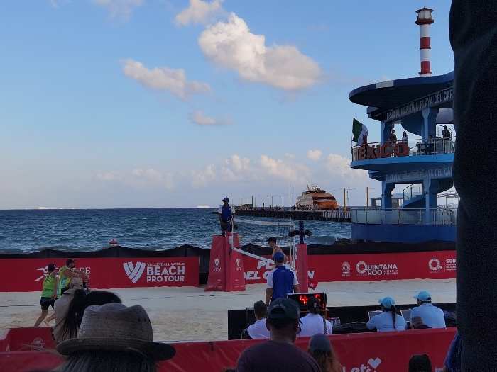 The scene is a beach volleyball court in Playa del Carmen, Mexico, located at 20