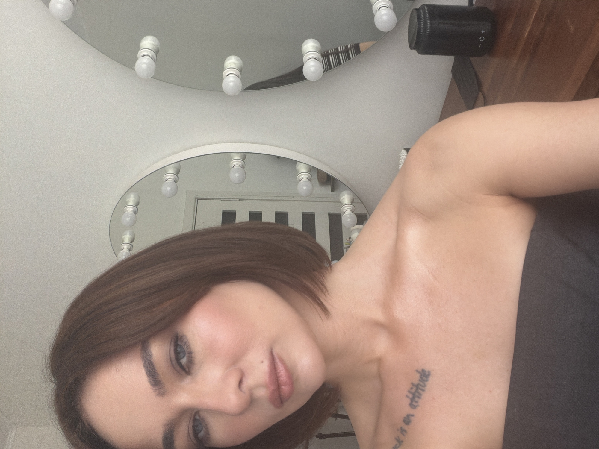 A selfie-style shot features a woman with auburn hair, light skin, and visible tattoo on her chest. Her face is angled towards the camera, revealing a makeup mirror illuminated by multiple bulbs behind her head. A dark object, possibly a speaker, is positioned on a wooden surface in the upper-right corner. The background includes a striped pattern partially visible in the mirror's reflection.