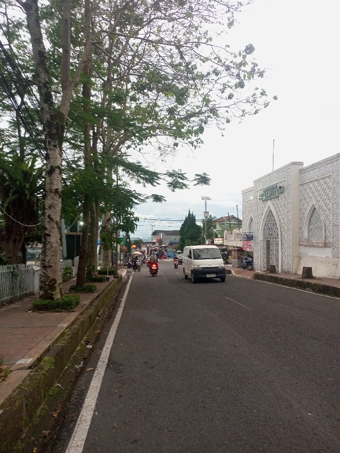 A street scene features a white van driving on a black asphalt road. Several motorcycles are further down the road. Trees line the left side of the road, while a white building with a patterned façade sits on the right. A white line separates the road from a curb on the left. The sky is overcast. In the distance, a body of water is visible beyond the road.