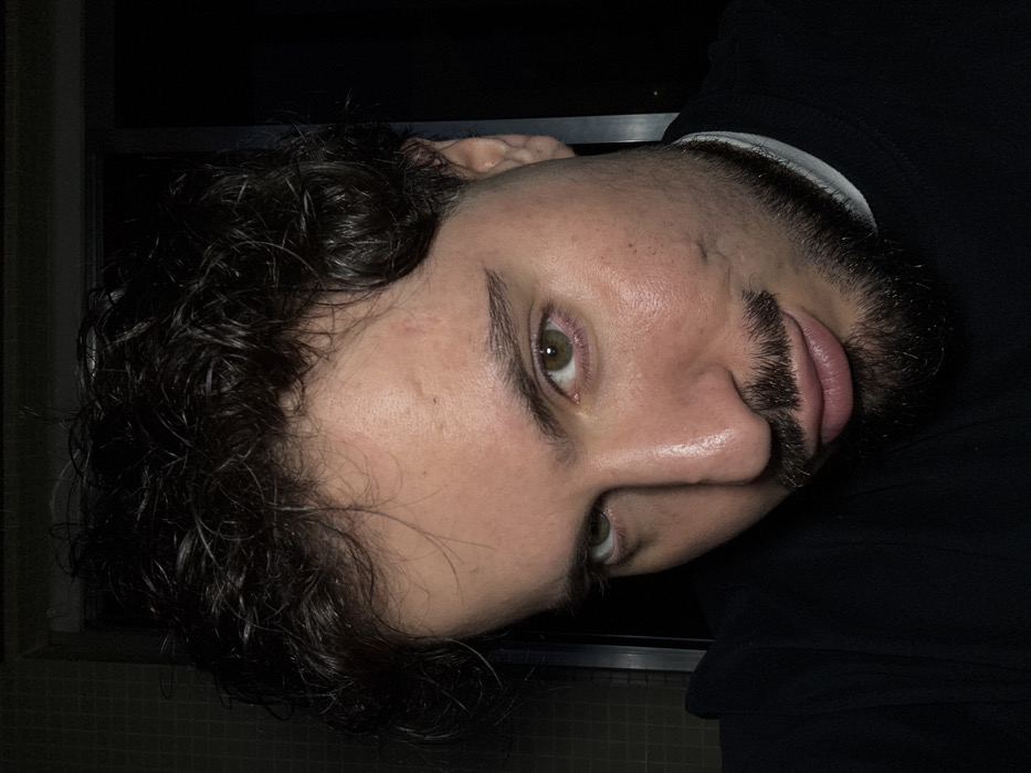 A man with olive skin, curly dark hair, and a thick beard faces the camera at an angle