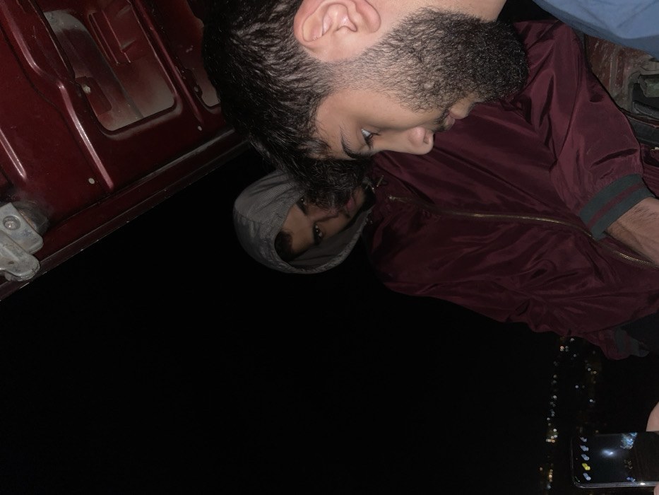 The image captures two males at night in Dummar Municipality, Syria, positioned with an urban landscape illuminated by scattered lights in the distant background