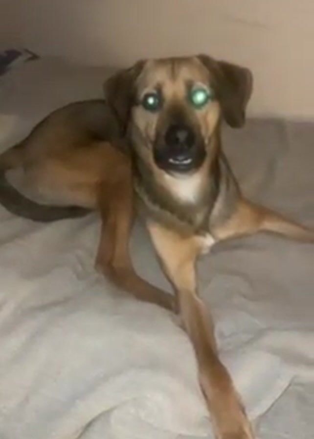 A medium-sized, tan and brown dog with glowing green eyes is lying on a light grey blanket. The dog gets up and walks toward the camera.