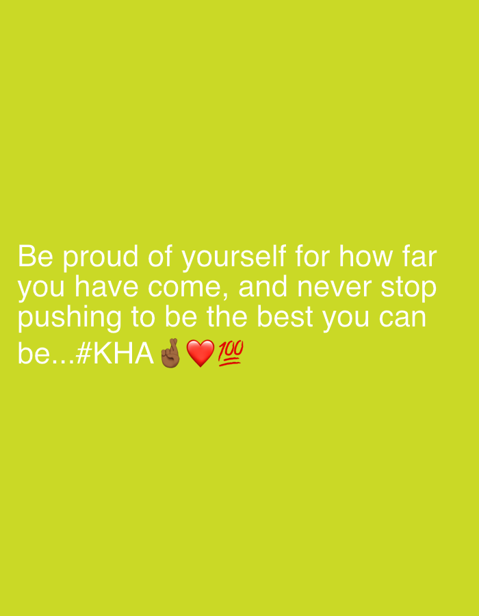 The image features an inspirational message in white text against a yellow-green background. It reads, "Be proud of yourself for how far you have come, and never stop pushing to be the best you can be..." followed by the hashtag "#KHA". Additional details include a dark-skinned hand with crossed fingers emoji, a red heart emoji, and a "100" points emoji, likely indicating support and encouragement.