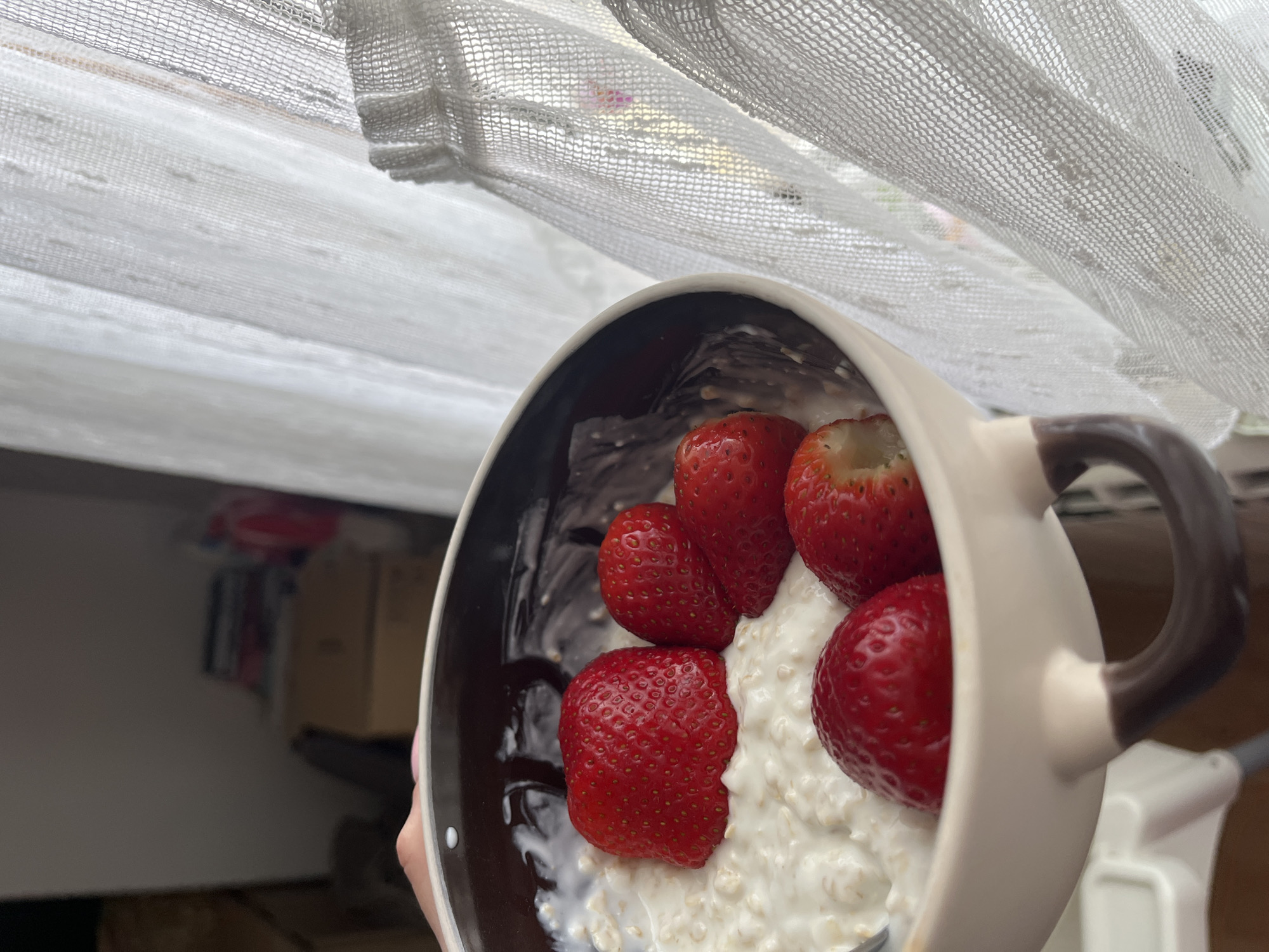 A human hand, with partially visible fingers and a light-colored nail polish, holds a beige and dark brown ceramic bowl containing a white, granular food substance, likely oatmeal or overnight oats. Five whole, ripe red strawberries are arranged on top of the food, with one large strawberry centrally positioned. The background to the right features a white, translucent curtain, appearing to be near a window, with visible pleats and a fine mesh texture. The background to the left is a blurred, dimly lit indoor space, showing a light brown wooden furniture piece, possibly a chest of drawers, with indistinct items on its surface. The specific location within the city of Pernik, Bulgaria, cannot be determined from the visual information provided.