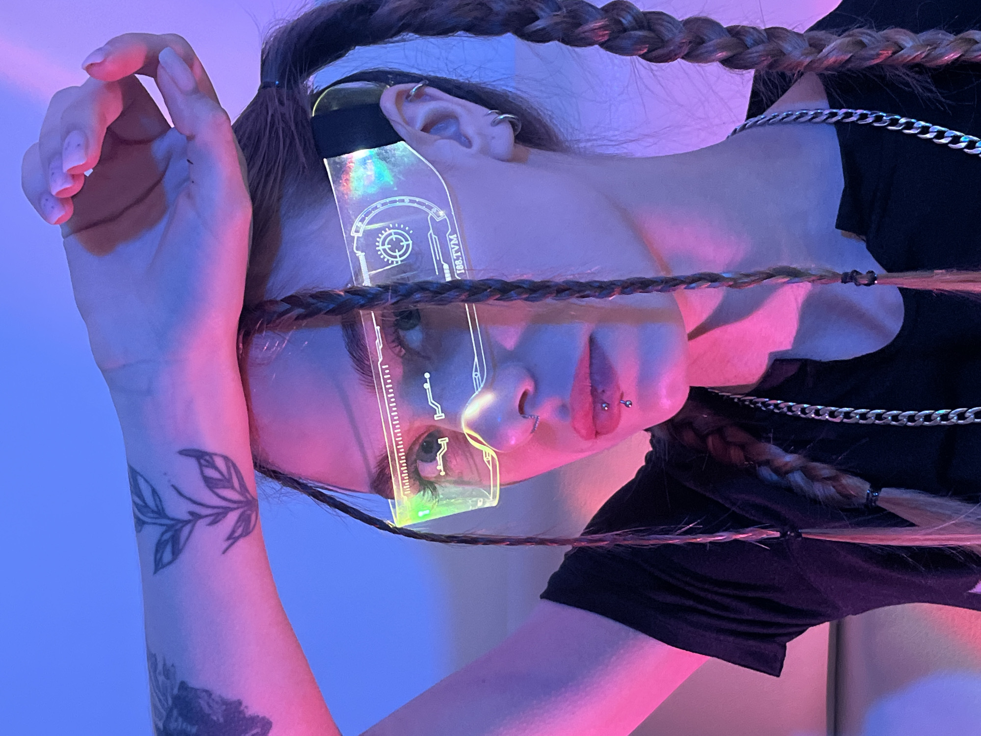 A woman with braided hair and tattoos on her arm is wearing futuristic eyewear