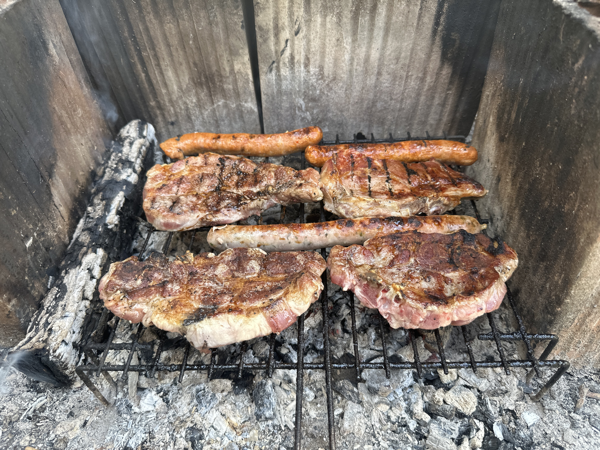 close-up of a grill with food cooking on it. There are four pieces of meat (likely pork chops or steaks) and three sausages on the grill. The grill is placed over hot coals or ash, and there is smoke rising from the food and the coals. The grilling is happening in what appears to be a built-in barbecue structure with wooden walls on three sides. The environment suggests an outdoor setting. The location given is Mirkovo, Bulgaria.