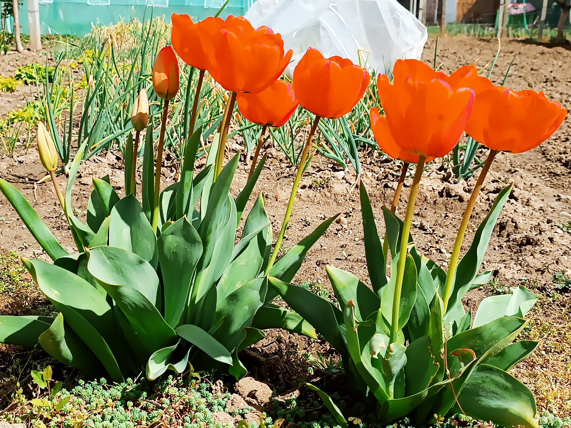 The image depicts a garden setting, likely in Kulata, Bulgaria, with several bright orange tulip flowers prominently in the foreground. The tulips are in various stages of bloom, some fully open and others still in bud. Their green stems and leaves are also visible. Behind the tulips, there is a row of green plants resembling onions or chives. In the background, a white structure, possibly a greenhouse or a protective cover for plants, can be seen. The soil appears to be dry and somewhat barren in areas, with patches of small, green ground cover plants at the base of the tulips. The overall impression is a cultivated garden space in an outdoor environment.