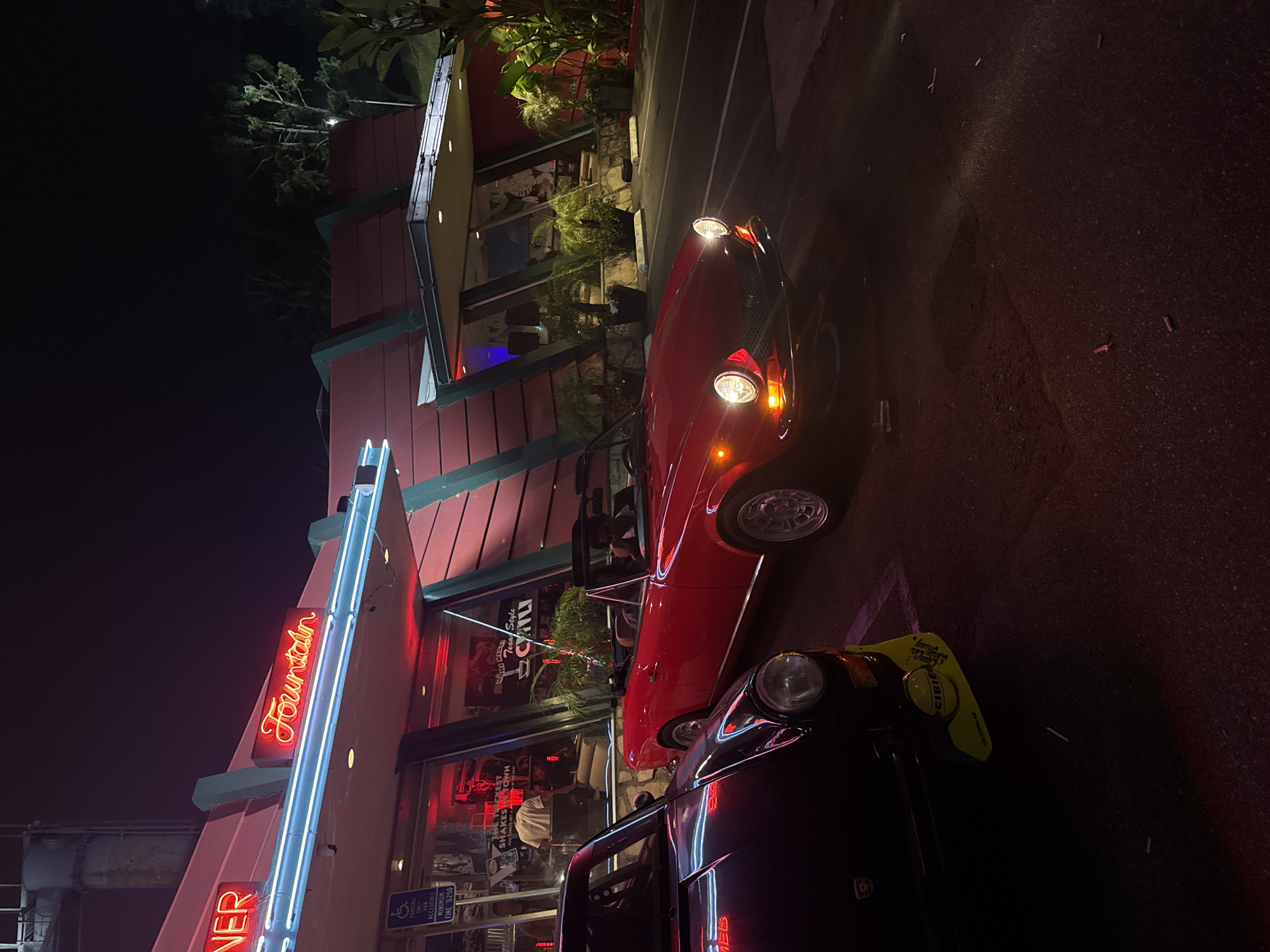 - "At night in West Hollywood, United States of America, a dimly lit scene presents a red Ferrari and a black Porsche parked near a restaurant named "Fountain Diner" whose name is spelled out with neon lights" by FM-363ge2, licensed under CC BY 4.0
