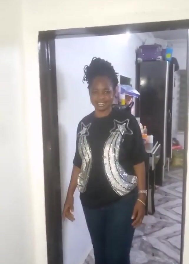 A woman stands smiling in a doorway, wearing a black t-shirt with silver star and trail decorations, and dark jeans. She is barefoot. The hallway is white, and a framed picture hangs on the wall to her left. Through the doorway, a room is visible with a patterned floor, dark cabinets, a suitcase, and other objects. The camera zooms in slightly during the video.