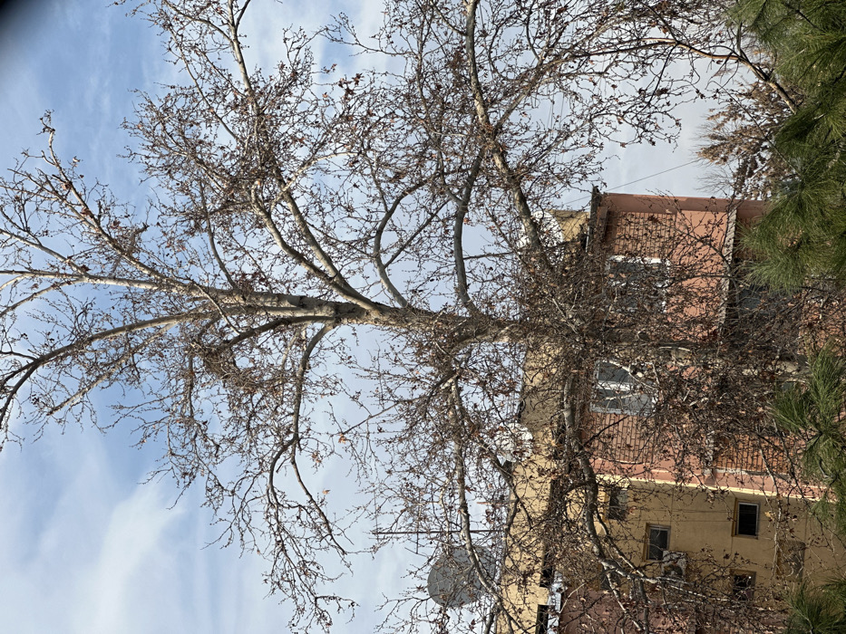 This image depicts an urban scene in Tashkent, Uzbekistan, during daytime in winter. The primary subject is a large, mature deciduous tree, likely a sycamore or plane tree, dominating the foreground with its extensive network of bare, light-colored branches and twigs. Sparse remnants of dried leaves or seed pods are visible on the branches. Behind and partially obscured by the tree, a multi-story building is visible. The building exhibits two distinct architectural sections: a left portion with a light brown/tan facade, featuring several dark, rectangular windows and at least one wall-mounted air conditioning unit. The right portion features a reddish-brown brick facade with larger, white-framed windows. On the building's roof, above the brown/tan section, a grey satellite dish is clearly visible, along with other antenna-like structures. The base of the building is partially obscured by green, evergreen foliage, possibly pine or fir, at the bottom of the frame. The sky above is blue with scattered, wispy white clouds. No individuals or specific actions are observed.