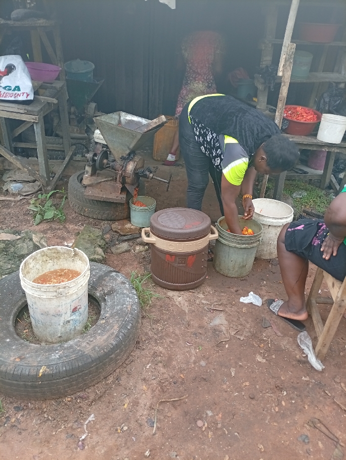 - "The image depicts an outdoor food processing operation in Obosi, Nigeria, occurring on reddish-brown earthen ground with scattered debris and sparse vegetation" by FM-vnTjF3, licensed under CC BY 4.0