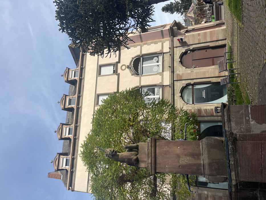 The image captures a public square in Saverne, France, under a clear blue sky on a sunny day. In the foreground on the left, a weathered brown stone fountain features a statue of a bipedal, seated mythical creature with an upright horn, possibly a unicorn. The fountain's pedestal exhibits some green discoloration. Behind the fountain, a large deciduous tree with bright green foliage partially obscures the left side of a multi-story building. This building's upper floors have a light pink/beige stucco facade with windows fitted with white roller shutters, some partially open. The roof is a dark slate mansard style, featuring four ornate dormer windows, each capped with a small spire. The ground floor is clad in dark stone, with arched openings containing commercial signage, including "Pilates" on the first floor and "BANQUE ASSURANCES" with a Crédit Mutuel logo on the ground floor. A brown double door is visible on the ground level. To the right, two dark metal benches are positioned on a strip of grass beside a cobblestone path that extends across the square. A distinctive, spiky-leaved conifer, possibly an Araucaria, frames the scene on the far right. In the far background on the right, a traditional carousel with a decorative conical roof is partially visible. One individual is seen walking away from the camera near the carousel, pulling a dark wheeled suitcase.