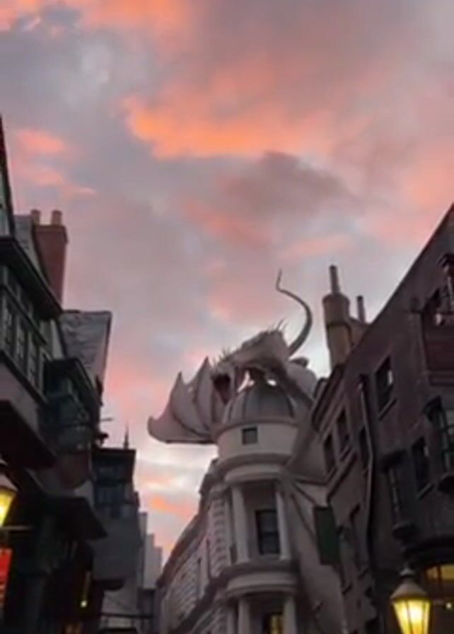 view of Diagon Alley at Universal Studios Orlando, with a focus on the dragon perched atop Gringotts Bank. The sky is a mix of pink, orange, and gray clouds. People are walking through the street. Streetlights illuminate the scene. The buildings are designed in a Victorian style.