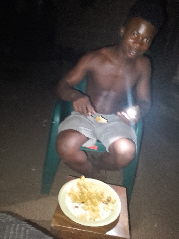 A shirtless man sits on a green plastic chair, eating from a plate with a spoon. He is illuminated by a bright light in his hand. The plate of food sits on a small wooden table beside the chair. The setting appears to be outdoors at night, given the dark background. The man looks towards the camera with a smile.