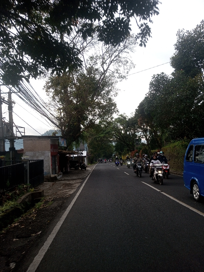 This image depicts an outdoor scene on an asphalt road in San Pya, Myanmar, under an overcast sky. The road, appearing to be a single lane or a wide two-way lane, runs from the foreground into the background, flanked by buildings and dense vegetation. A solid white line marks the right edge of the visible carriageway. On the left side of the road, in the midground, stands a single-story building with light-colored walls and a dark roofline. An open-front shop area is visible, displaying a red sign, partially obscured but appearing to be a "HONDA" logo. A utility pole with numerous tangled electrical and communication wires is situated directly in front of this building. Two dark-colored motorcycles are parked on the dirt verge near the shop. Further left, a dark metal fence runs parallel to the road. The immediate foreground on the left features a dirt verge with sparse vegetation and a small drainage ditch. In the background, beyond the building and utility pole, more trees and distant hills or mountains are visible. On the right side of the road, in the immediate foreground, the side and rear wheel of a blue minivan are visible, indicating it is traveling in the same direction as other vehicles. Following the minivan, a procession of at least 10-15 motorcycles and scooters occupies the road, moving away from the viewer. Riders are visible, most wearing helmets. A white scooter with a rider wearing a white top and a dark helmet is prominent in this group, followed by various other motorcycles and scooters of differing colors. Dense green trees line the right side of the road, extending into the background and forming a canopy over the distant sections of the road. The sky is uniformly overcast, providing diffused lighting. Dark green foliage from nearby trees frames the top left and right portions of the image.