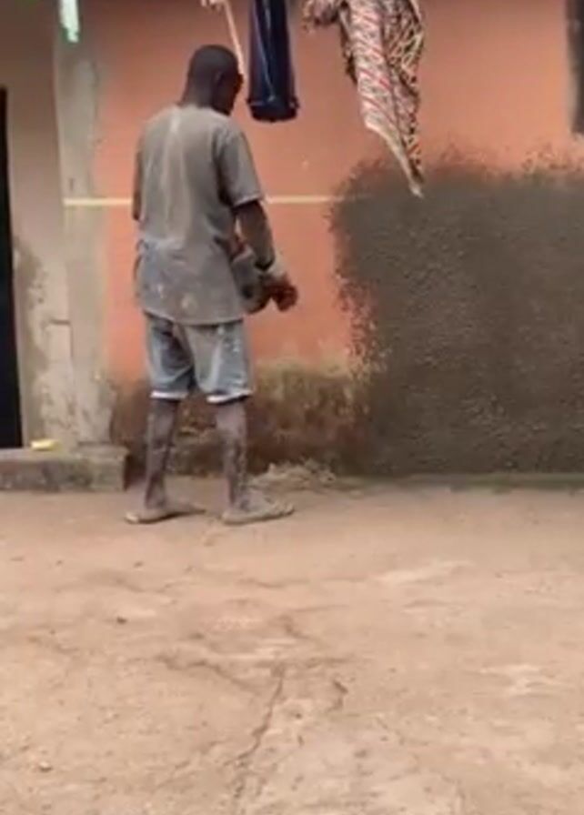 An adult male plasterer is shown from the waist up, plastering a wall. He’s using a bucket of plaster to scoop the material and throw it against the wall, which has a light orange background and a roughly plastered area that is grey. The man is standing in a dusty dirt yard next to a tan building. He is wearing a light grey t-shirt and cutoff denim shorts, and light brown sandals. He has pink gloves on his hands. Clothes are strung up on a line behind him. The video follows his movement in a pan as he walks to the left. The man seems to be the only person present.
