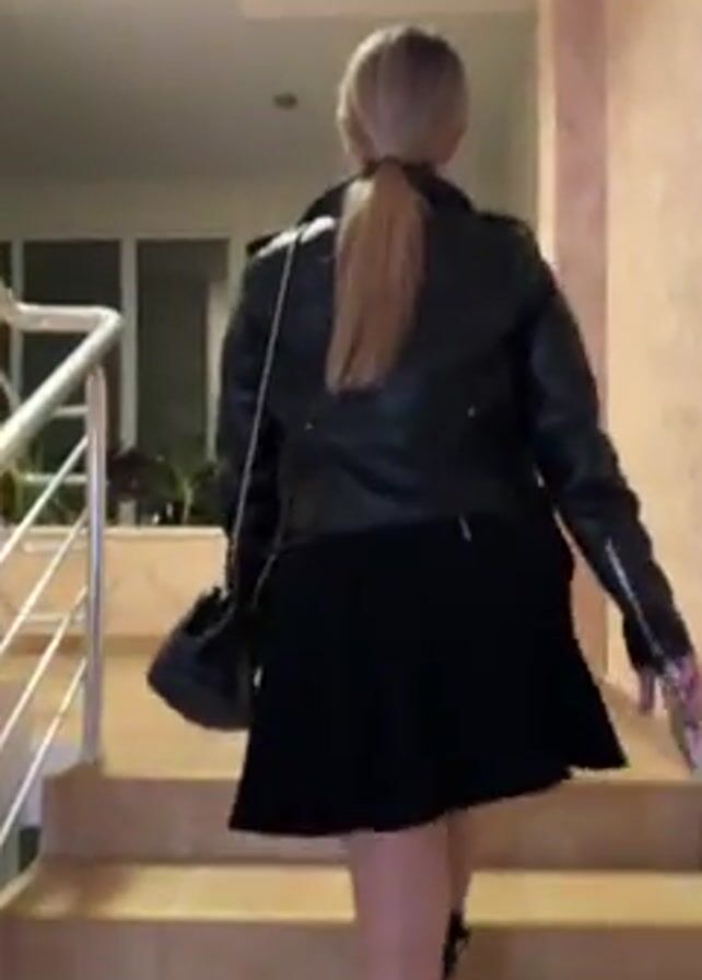A woman is walking up a staircase, seen from the rear. She is wearing a black leather jacket, a black skirt, and black boots. She has a dark bag slung over her shoulder. Her hair is light brown and pulled back in a ponytail. The staircase has a silver metal railing and light brown tiled steps. The walls are light beige with a slightly textured pattern. A window with plants is visible through a doorway. The woman turns her head to look upwards as she ascends the stairs.