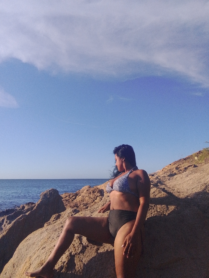 - "A woman in a bikini sits on rocks near the ocean under a clear blue sky with scattered clouds" by FM-ymGPj1, licensed under CC BY 4.0