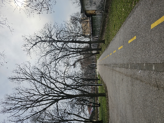 The image displays an empty paved pathway extending linearly into the distance, situated in the city of Vidin, Bulgaria. The pathway consists of gray asphalt, divided longitudinally by a central strip of dark gray square pavers. The section of the path to the right of the pavers features intermittent yellow dashed lines, indicating a designated lane. The left section of the path is unmarked. The pathway is flanked on both sides by numerous leafless deciduous trees, their bare branches silhouetted against a predominantly overcast, light gray sky with a brighter area in the upper right quadrant suggesting obscured sunlight. The ground areas adjacent to the path are covered with sparse green grass and scattered fallen leaves. To the left of the path, beyond the trees, multi-story buildings with light-colored facades and reddish roofs are partially visible. Several vertical streetlights are also present along this side. To the right of the path, a low, dark green corrugated fence or railing separates the pathway from a weathered yellow-brown wooden structure or building. A section of a wall or fence on the right exhibits graffiti. No individuals or animals are present in the scene.