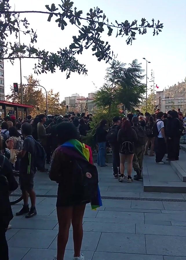 Here's a concise description of the video: The video shows a crowd of people gathered on a paved area, possibly a plaza or street. Most people are dressed casually. One person in the foreground has a rainbow flag draped over their backpack. Some people are standing and chatting, while others appear to be waiting. There is a bus stop visible on the left. Buildings and trees are visible in the background, and the sky is bright. The overall impression is that of a gathering or demonstration.