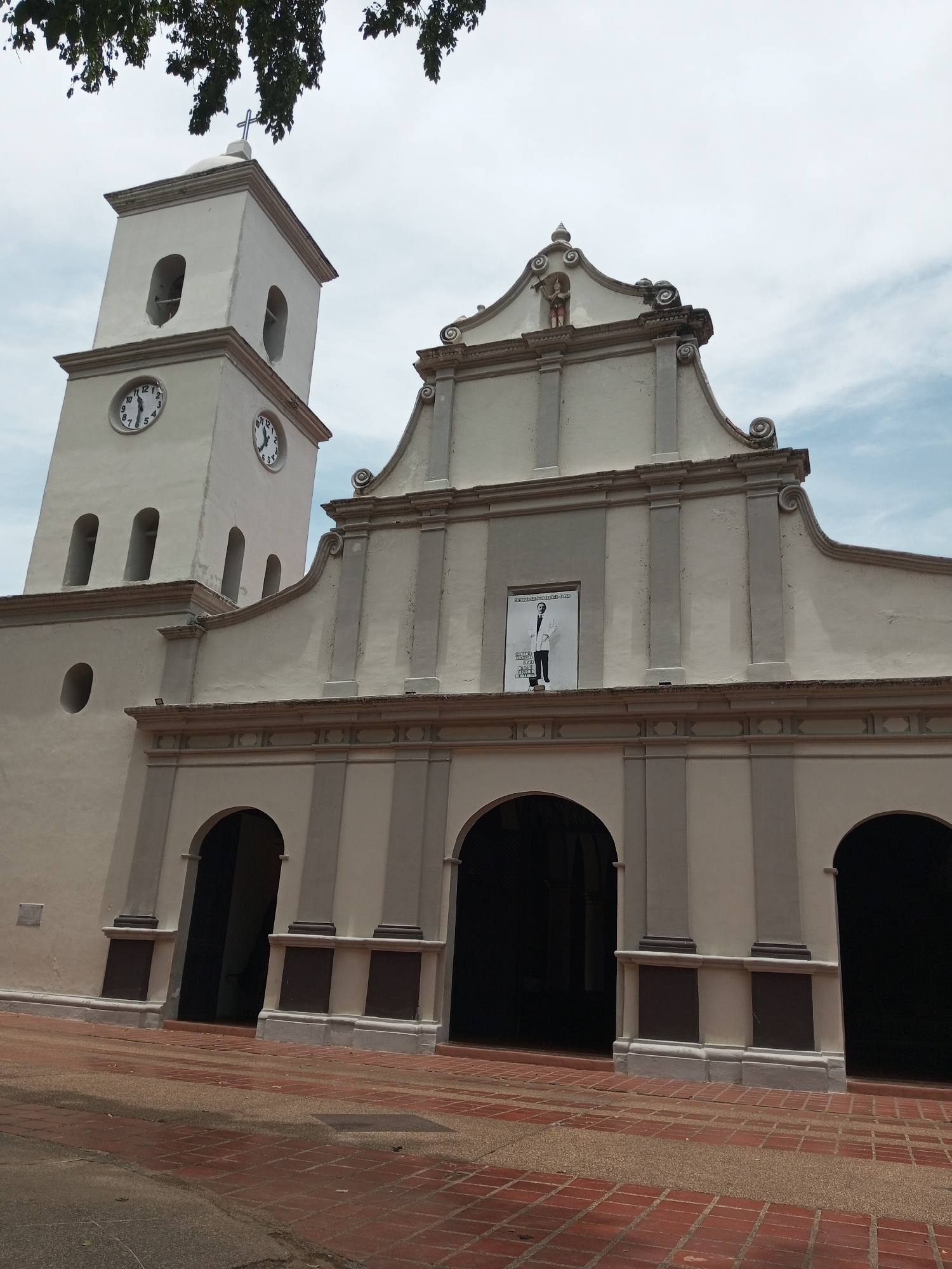 front facade of a church in El Pao, Venezuela. The church is a light color with grey accents, with a tall tower on the left and a central entrance area with archways. The tower has clocks on two sides. Above the entrance is a triangular pediment with a statue at the apex. A poster is affixed to the facade above the arches. The ground is paved with red bricks. The sky is overcast. A tree is visible in the upper left corner.