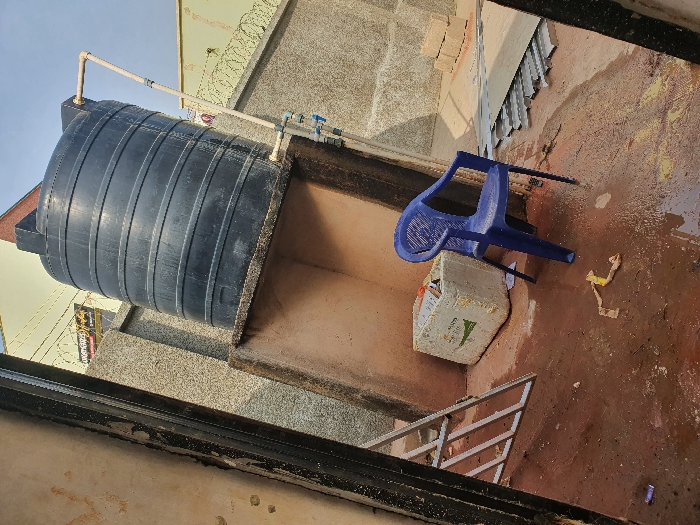 The scene depicts an outdoor utility or service area, possibly a courtyard or rooftop, in the city of Unknown, Unknown. The ground is a reddish-brown, wet, and appears to have standing water and scattered debris, including a torn yellow wrapper and a small purple cylindrical object. To the left, a white metal triangular frame, possibly part of a gate or railing, leans against a wall. In the midground, a white polystyrene cooler box containing various items is situated next to a single blue plastic monobloc chair. Further right, corrugated metal sheets and several concrete blocks are stacked. A prominent feature is a large, black, horizontally corrugated plastic water tank, elevated on a rectangular, unpainted concrete base. A white PVC pipe system is connected to the tank, extending downwards with multiple blue-handled valves, and another pipe extends upwards. In the background, a light yellow building is visible behind a concrete wall topped with barbed wire. A commercial sign featuring yellow text, partially reading "LAW", is faintly discernible behind the barbed wire. The sky overhead is light blue. No individuals are present in the image.