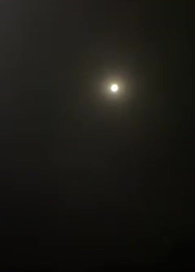 bright, blurry orb centered in the frame against a mostly dark background. The orb likely represents the moon or a bright light source, as its brightness obscures finer details around it. The background, though primarily dark, appears to have some texture or variation in shading, suggesting a night sky or a dark, textured surface. The camera seems to be looking up towards the light source.