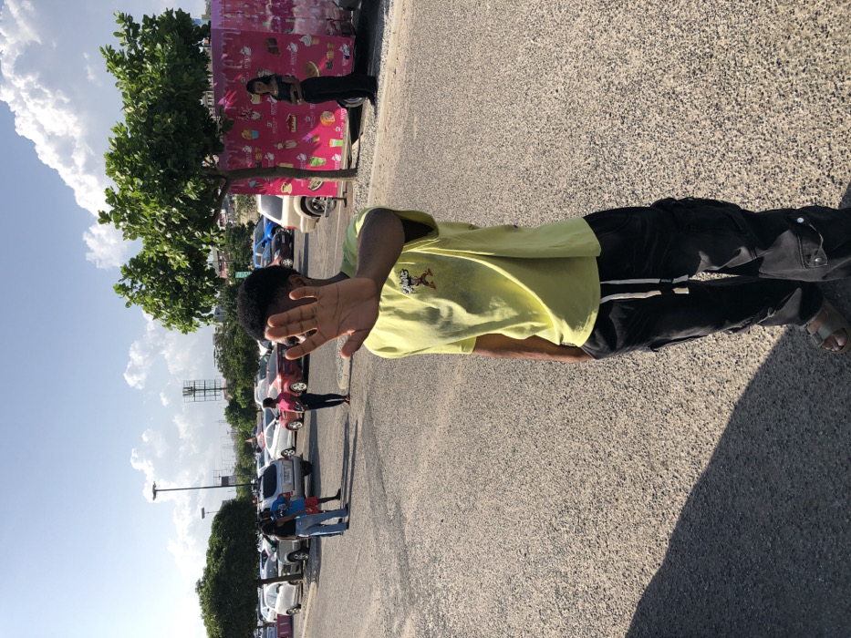 The image depicts an outdoor scene in a paved parking area, identified as Mile 11, Ghana, under a clear to partly cloudy sky. A male individual stands in the foreground, facing the camera. He wears a light yellow t-shirt with a small graphic on the left chest, dark cargo pants with a white drawstring, and light-colored sandals. His right arm is extended towards the camera, palm open and fingers spread, partially obscuring his face. In the mid-ground and background, a large parking lot is visible, occupied by numerous parked cars of various models and colors, including white, silver, red, and blue vehicles. To the left, three individuals are gathered near parked cars. To the right, a woman dressed in dark clothing stands near a vibrant pink kiosk or food truck decorated with illustrations of desserts. Several small to medium-sized trees with green foliage are planted within the parking area. A tall light pole stands in the left background, and a larger structural element, possibly a billboard, is visible further in the distance. The scene is brightly lit by natural sunlight, casting shadows on the asphalt surface.