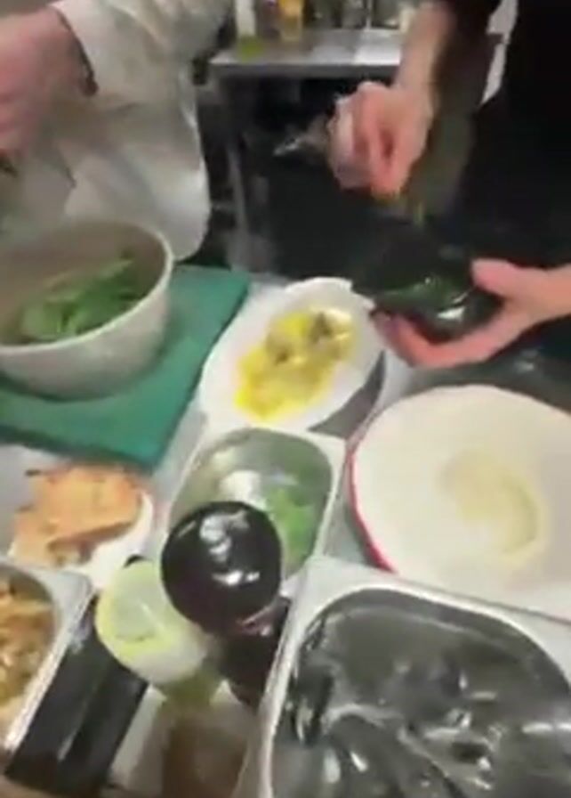 quick glimpse of food preparation in a commercial kitchen. Two individuals are seen. One person is preparing greens and another is placing dishes of food on a counter. The dishes consist of a pasta dish with yellow sauce, and a second pasta dish with what appears to be a red sauce. There are other bowls and ingredients on the counter around the plates. The environment appears to be a busy, professional kitchen setting.