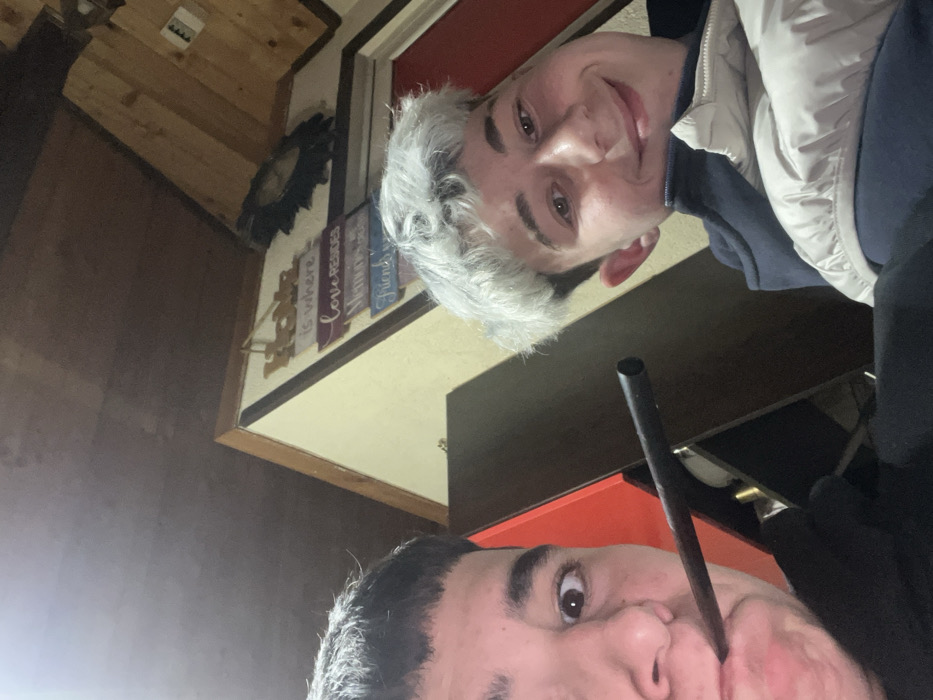 Two young males are depicted indoors in what appears to be a residential or casual setting within Botevgrad, Bulgaria. The specific location within the city cannot be visually confirmed beyond an interior space. The ceiling is dark brown, possibly wood-paneled, with light-colored walls. A multi-layered wall decoration featuring phrases like "Home is where love resides" and a dark, ornate wall ornament are visible in the background. The individual on the left, partially cropped, has dark hair and a wide-open right eye, looking towards the camera. A black, cylindrical object, consistent with a vaping device or hookah mouthpiece, is held in their mouth. Their left hand, covered by a black glove, is visible below the object. The individual on the right has light, silver-blonde curly hair on top and darker hair on the sides. They are smiling broadly at the camera, wearing a dark blue hooded top under a light-colored puffer vest or jacket. A dark brown cabinet or shelf unit with red accents is partially visible behind the left individual.