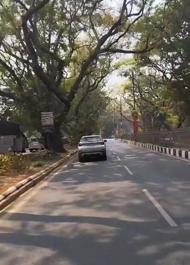 A vehicle travels down a tree-lined road. The road is paved and has a solid white center line. A silver-colored car is ahead in the same lane. The road is bordered by sidewalks and a low barrier with decorative red and yellow embellishments. Lush, mature trees with broad, twisting branches arch over the road, creating a canopy that filters the sunlight. A small sign is visible on the left side of the road, partially obscured by the trees. The camera appears to be mounted on a motorcycle or scooter. The sky is bright and sunny.