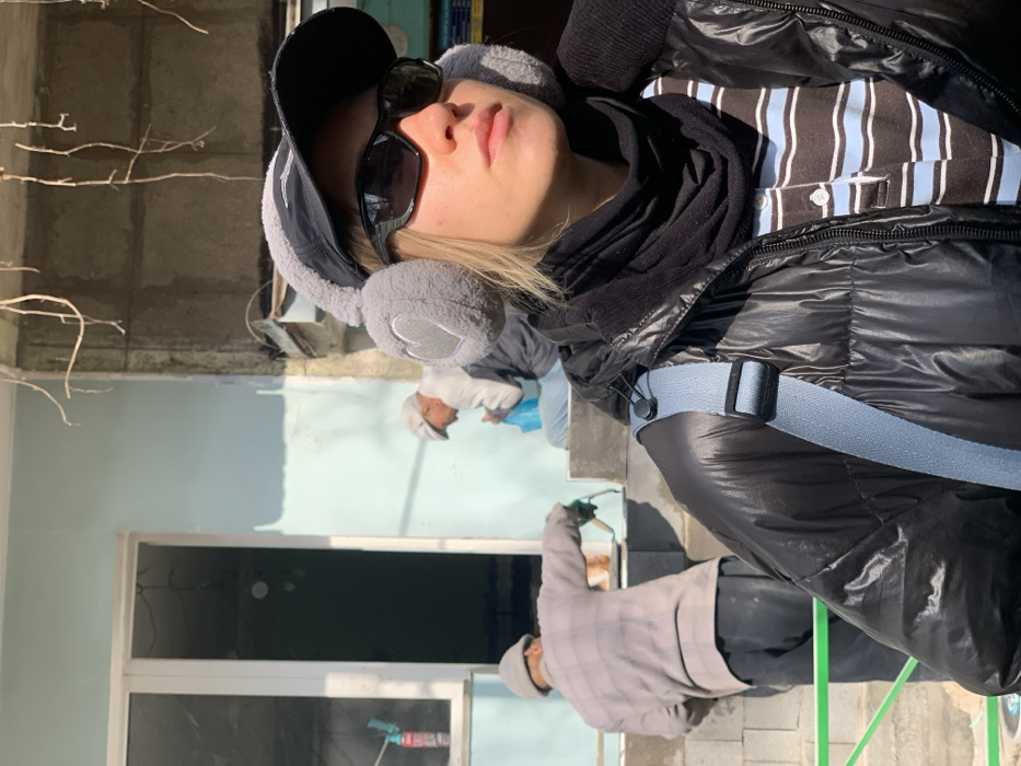 The image depicts an outdoor scene in Almaty, Kazakhstan, under bright sunlight. In the right foreground, a person with blonde hair is visible from the chest up, wearing a black baseball cap, dark rectangular sunglasses, grey fuzzy earmuffs with a silver heart emblem on the left ear, a black neck gaiter, a dark shiny puffer jacket, and a striped polo shirt (dark, light blue, and white stripes). A light blue strap from a bag crosses their right shoulder. Their gaze is directed slightly upwards and to the right. In the midground, two older males are present near a building. To the left, one male, wearing a light plaid long-sleeve shirt, dark pants, and a light beanie, is bent over, operating a power tool on a light-colored block structure. A can of spray foam rests on a windowsill behind him. To the right, another male, wearing a light-colored hat, a light shirt, and dark pants, is seated on a concrete step, holding a light blue plastic bag. The background building features a light blue painted section with a white-framed window or door opening revealing internal wiring. To its right, the building transitions to a rough, darker concrete or stone facade with several bare, dry vines hanging from above. A green metal railing is partially visible in the lower-left corner.