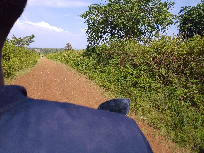 A dirt road stretches ahead, flanked by dense greenery on either side, under a partly cloudy sky. The perspective is from a vehicle, with a portion of its body visible in the foreground. A small figure can be seen in the distance on the road. The vegetation consists of bushes, trees, and grassy areas. The road itself is reddish-brown and somewhat uneven.