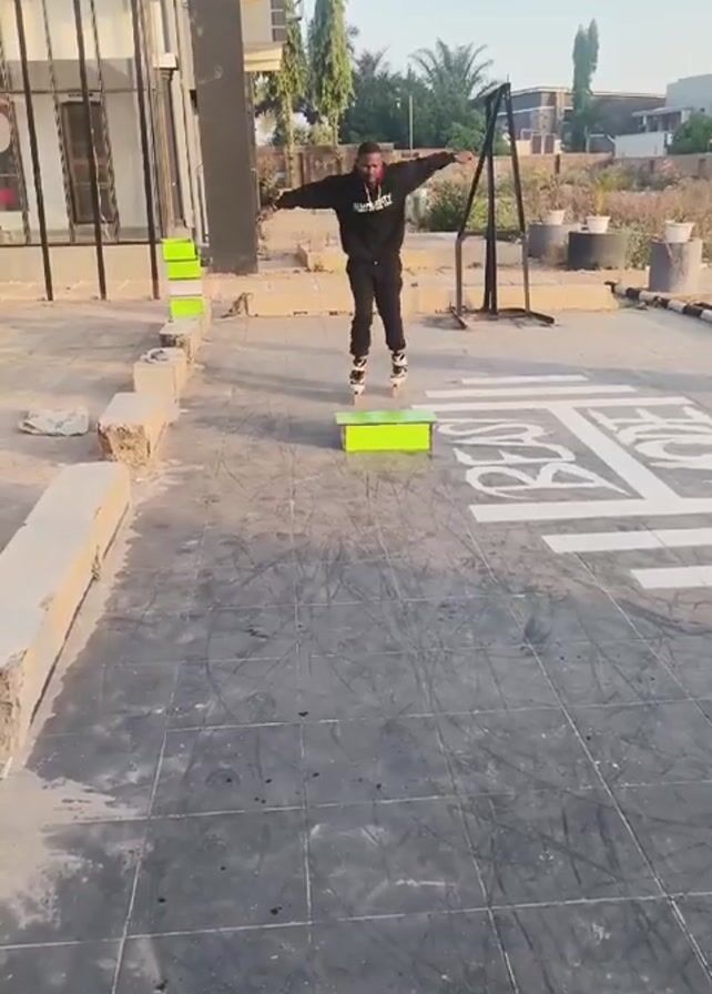 young person on inline skates jumping over a neon green block and landing successfully. The individual is wearing a black hoodie and black pants. The setting is an outdoor paved area with a white design painted on the ground. There are other blocks with neon green accents around the perimeter. In the background is a building and some vegetation. The lighting suggests it is daytime.